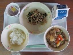 献立:牛乳、ご飯、大根と里芋のそぼろ煮、納豆、キャベツのピリッと漬け
