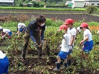 高橋農園さんのお声かけをいただき、じゃがいも掘りの体験をさせていただきました。1・23学年が参加し、メークインをたくさん掘ってきました。じゃがいもの苗の茎を引っ張り、抜けたあとを丁寧に掘り起こしてみると、黄色に輝く大きないもがゴロゴロ出てきます。子どもたちはもう夢中でした。
