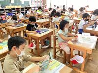 本日の業間は、校庭の暑さ指数(WBGT)が31に達したため、室内で過ごすことになりました。子供たちは、教室で、タブレットを使ったり、本を読んだり、トランプをしたりして、静かに過ごしていました。これから運動会の練習も本格的になるので、早く暑さが治まってほしいと思います。