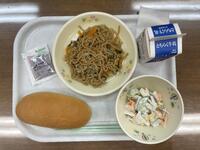献立:牛乳 コッペパン とちおとめジャム 焼きそば カリコリサラダ