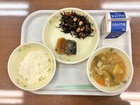 献立:牛乳 ごはん さばの味噌煮 五目ひじき さつま汁