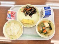 献立:牛乳 ごはん 彩り野菜の卵焼き ひじきの炒め物 五目味噌汁 さけぱっぱ