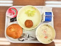 献立:牛乳 ミルクパン チョコパテ 野菜入り肉団子 和風サラダ ほうとう