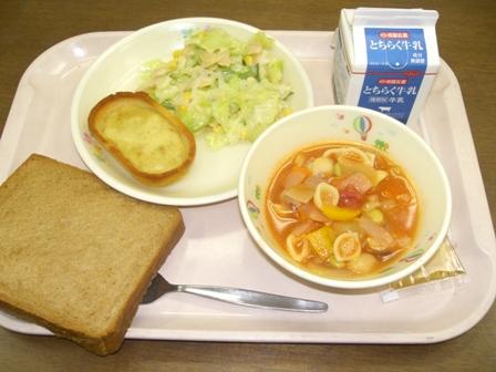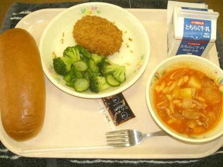 本日の献立メニュー:牛乳、黒ロール、野菜コロッケ、ボイルキャベツ、シーフードチャウダー、