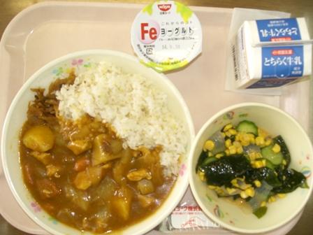 本日の献立メニュー:牛乳、麦ご飯、ポークカレー、福神漬、野口菜のおひたし、バナナ