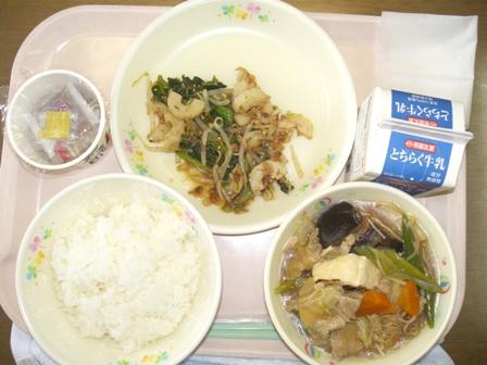 献立メニュー:牛乳、ご飯、豚肉と野菜のみそ炒め、ほうれん草ときのこのスープ、