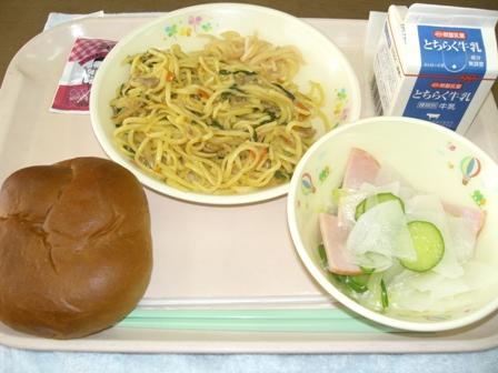 本日の給食メニュー:牛乳、ミルクパン、焼きそば、アスパラとハムのマリネ、ヨーグルト、