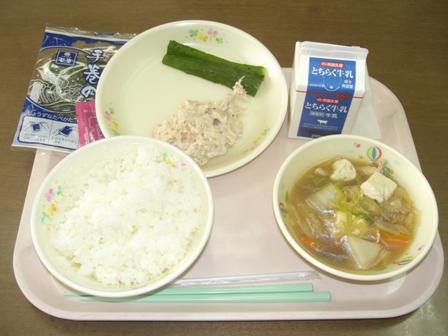 本日の献立メニュー:牛乳、ご飯、ブリの冬がすみ焼き、即席漬け、どさんこ汁、ふりかけ