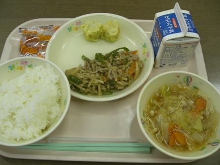 本日の献立メニュー:牛乳、ご飯、チンジャオロース、コーンシュウマイ、春雨スープ、