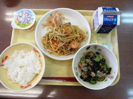 牛乳 ごはん えびのしゅんはいふう焼きそば ツナと大根のサラダ お米のムース