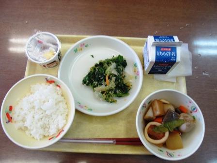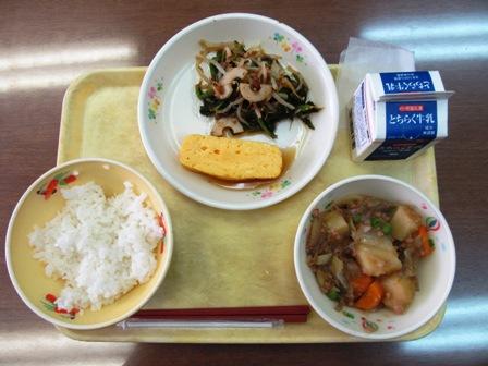 牛乳 ごはん じゃがいものそぼろ煮 小松菜とちくわの和え物 厚焼き玉子