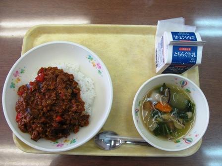 牛乳 麦ご飯 茄子入りドライカレー 肉団子スープ