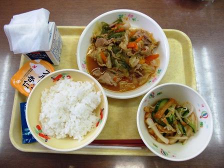 牛乳 ご飯 豚肉と野菜のみそ炒め もやしとさつまあげのナムル フルーツあんにん