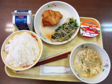 牛乳 ご飯 鶏肉のレモンソース和え ニラともやしのキムチ和え かき玉汁
