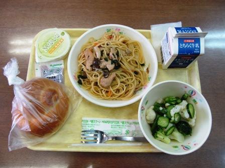 牛乳 米粉パン キノコスパゲティー イタリアンサラダ ラ・フランスゼリー