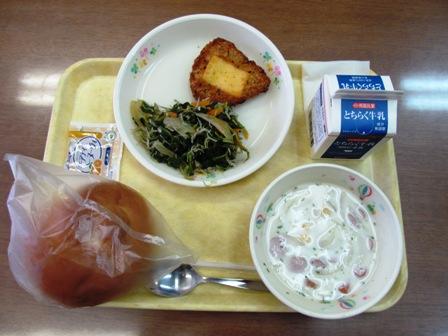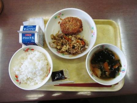 牛乳 ごはん ひじきコロッケ ゴーヤチャンプル わかめスープ