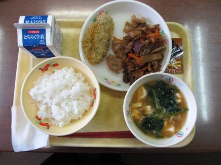 牛乳 ごはん ホキ磯辺フライ レンコンのきんぴら あさりの味噌汁 ふりかけ