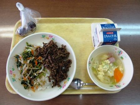 牛乳 ビビンバ 玉子スープ 巨峰2個