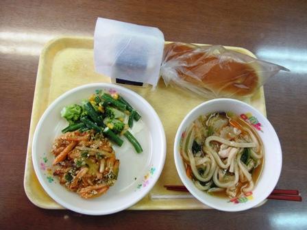 牛乳 レーズンパン 天ぷらうどん おんやさいサラダ
