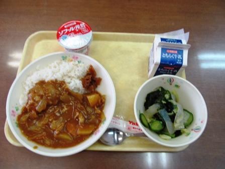 牛乳 五穀ご飯 ポークカレー 福神漬け コンニャクサラダ ヨーグルト