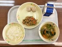 献立:牛乳 ごはん チンジャオロース えびしゅうまい 高野豆腐のスープ