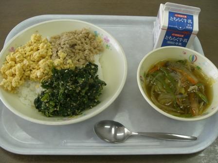 本日のメニュー:牛乳、三色そぼろ丼、沢煮椀