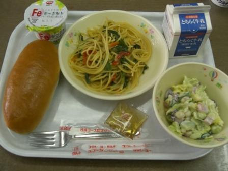 本日のメニュー:牛乳、ミルクパン、にらとひき肉のピリ辛スパゲッティ、ビーンズサラダ、