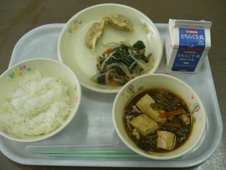 本日のメニュー:牛乳、ご飯、麻婆豆腐、焼き餃子、ナムルサラダ