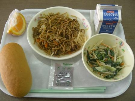 本日のメニュー:牛乳、コッペパン、焼きそば、ごぼうサラダ、いよかん、県産とちおとめジャム