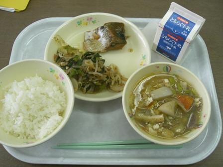 本日のメニュー:牛乳、ご飯、トロあじねぎ塩焼き、ひじきの炒り煮、どさんこ汁