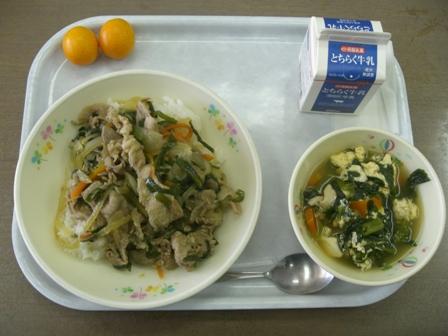 本日のメニュー:牛乳、スタミナ丼、ほうれん草と豆腐のスープ、きんかん