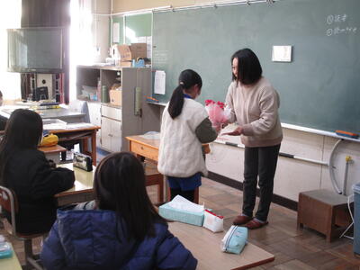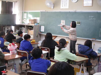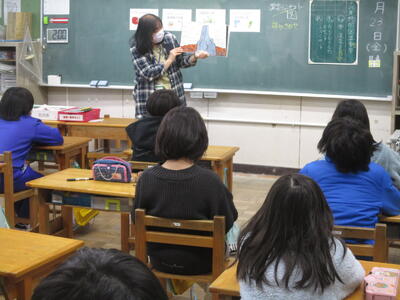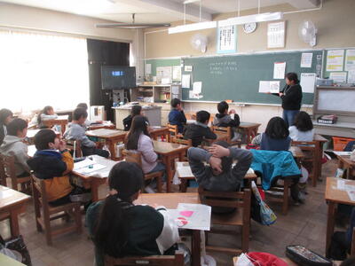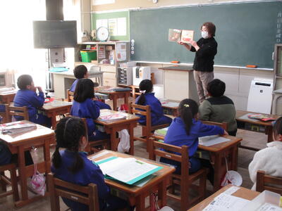 1・2年生は、2週間に1時間、外国語活動の学習を行っています。3・4年生は週に1時間です。5・6年生は外国語科(英語)の学習として週に2時間程度授業を行なっています。担任とALT(外国語指導助手)とともに楽しく授業が展開されます。