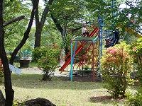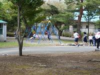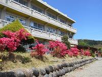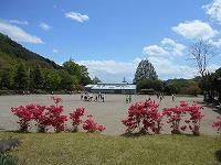 校庭周辺のつつじの花が綺麗に咲く中、子どもたちがたくましく走り回っています。
