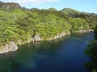 今まさに新緑の中、通学路のつり橋からの眺めは最高です。そこを毎日通っている下原小学生は揺れるつり橋を慎重に渡っていきます。下級生には周りの景色を眺める余裕はまだないようです。