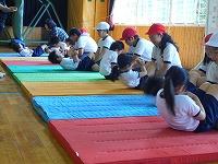 本日は新体力テスト2日目として、20mシャトルラン、長座体前屈等を実施しました。20mシャトルランは、体育館で20mの距離をテンポを示す音に合わせて往復し、持久力を測定する種目です。測定に当たり、低学年は高学年とペアを組んで、往復回数の記録をとってもらいます。記録をとる5・6年生は、時折、低学年に「がんばれ」と声を掛けながら、ミスがないよう2人組で数えます。