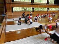 昨日までの猛暑も一段落し、本日はだいぶ過ごしやすい天候となりました。一安心です。そんな中、本日は業間の時間に、体力づくり集会を実施しました。