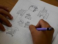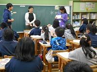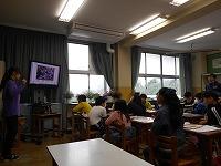 算数の時間は、学習のまとめのプリント学習でした。教頭先生が問題を一つ一つ説明し、1年生はそれを真剣に聞いてから、問題に向かっていました。果物や動物の数を正確に数え、答えを丁寧に記していました。