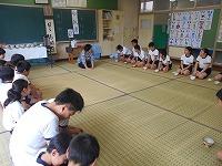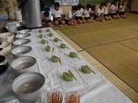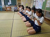 室町時代からの文化の流れ、茶の湯の作法等を説明いただいた後、和菓子、抹茶の頂き方を実際に体験しました。慣れないいくつかの所作をこなしながら、抹茶の味をそれぞれ味わっていました。正座の姿勢を保つことに辛さを感じている児童が一番多かったようです。