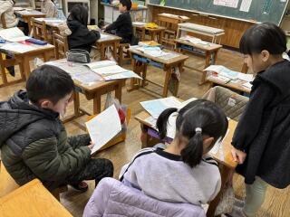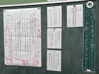 児童は、スピーチの冒頭を「みなさんは、何をする時間が好きですか。」と質問の語りにするなど、教科書の例文を参考に工夫して書いていました。