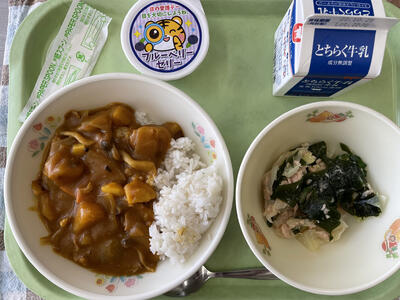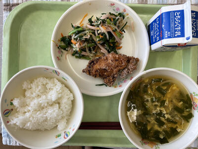 本日の献立「ご飯・牛乳・鶏のから揚げ・磯和え・かみなり汁・ワインゼリー」