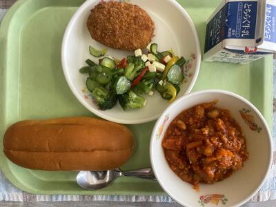 本日の献立「ミルクパン・牛乳・豚肉コロッケ・イタリアンサラダ・チリコンカン」