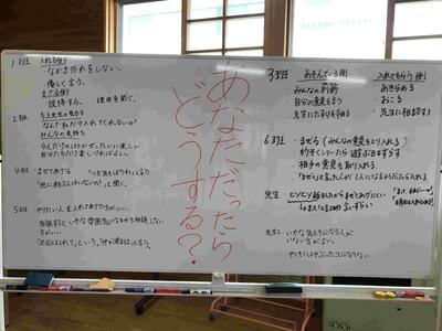 あいさつについて、掲示板を使ってみんなの考えを募ったら、たくさん書いてくれました。