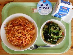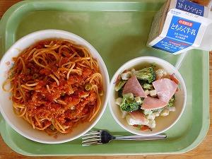 今日は,調理員さんの都合(月曜日から,通常2人のところ,1名で)で,献立が変更になっています。御了承ください。献立は,「大盛りスパゲティーミートソース・牛乳・温野菜サラダ」でした。やはりスパゲティーは,ミートソースからでしょう。おいしくいただきました。また,食べ過ぎかもしれません(運動しなくては・・・)。ごちそうさまでした。