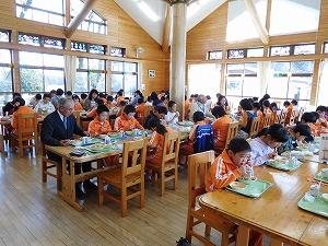 今日の献立は,「セルフドック・牛乳・きつねうどん・アセロラゼリー」でした。今日は,敬老会の方々との,「ふれあいソフトボーリング大会」が行われました。今日の給食の時間は,大会後の会食会と表彰式が行われました。敬老会の方々との楽しく温かなひとときを過ごすことができました。会食の様子も,合わせて御覧ください。