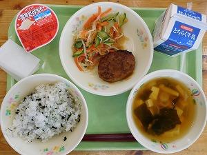今日の献立は,「わかめご飯・和風おろしハンバーグ・牛乳・クラゲ和え・みそ汁・雪見大福」でした。今日の献立は,6年生のリクエスト献立ということです。これも,小学校最後の思い出になりますね。私も,今日は,みんなと一緒に食べました。おいしくいただきました。ごちそうさまでした。