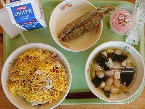 今日の献立は、「ちらし寿司・牛乳・いわしのカリカリフライ・そうめん汁・七夕ゼリー」でした。ちらし寿司とそうめん汁のコンビネーションが、とても良かったです。今日もおいしくいただきました。完食です。ごちそうさまでした。
