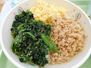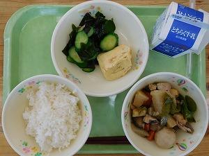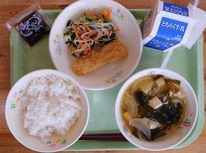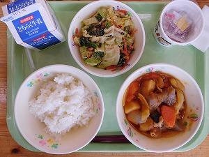 今日の献立は,「ご飯・牛乳・冷や奴・肉じゃが・ほうれん草のごま和え」でした。肉じゃがのジャガイモが,ほくほくしていてとてもおいしかったです。「新じゃがなのかな!?」などと思いながら,いただきました。今回は,新しい容器での「冷や奴」も登場しました。今日も,完食,ごちそうさまでした。