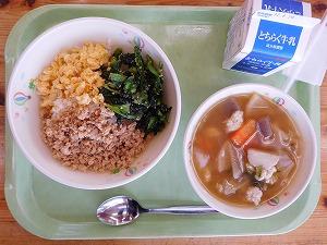 今日の献立は,「ご飯・牛乳・三色丼・雷汁」でした。今日もおいしくいただきました。完食です。ごちそうさまでした。今日は,茶道教室リハーサルの日でしたので,萬徳先生をはじめ,計6名の先生方と全校児童との会食でした。茶道教室は,いよいよ明日が本番です。6年生の子どもたちは,今日のリハーサルを含めて6回の御指導をしていただいて,みるみる上達しています。明日の本番が,楽しみです。追伸:お昼休みの前に,「二宮デー」がありました。今回は,下学年が,校庭の草取り,上学年が,「轟小ファーム」の草取りでした。