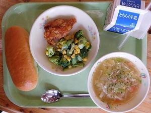 今日の献立は,「食パン・牛乳・鶏唐揚げレモンソース・海藻サラダ・むらくも汁」でした。献立の中に,ご飯から食パンへの変更がありましたので,御了承ください。今日も調理員さんが1人ということで,がんばって作っていただきました。ありがとうございました。もちろん,残さず完食です。おいしくいただきました。ごちそうさまでした。インフルエンザ感染予防のため,1月26日から,各教室で給食を食べています。来週からは,ランチルームで全員で食べられるといいと考えています。