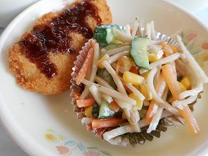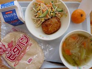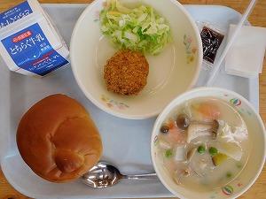 今日の献立は、「コッペパン・牛乳・県産豚肉コロッケ・ゴボウサラダ・トマトスープ」でした。午後は、運動会前日準備です。おいしい給食を食べてがんばります。